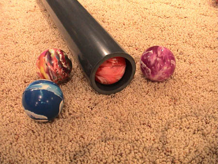 Not too much to say here.....A picture is worth a thousand words. 2" SCH 80 pipe has the same Outer Diameter (OD) as SCH 40 but due to it's heavy wall thickness it has a smaller Inner Diameter (ID). This smaller bore makes it perfect for the 2" super balls I offer. It also works extremely well with golf balls provided a small piece of rag is used as a patch.